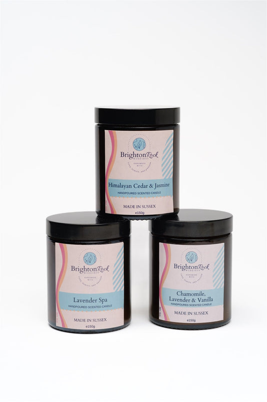 Chamomile, Lavender & Vanilla Scented Candle in Amber Glass Jar 150g